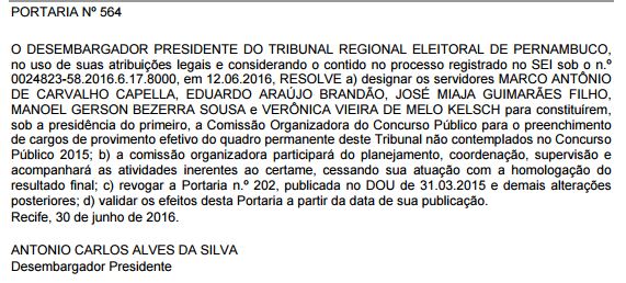 O Tribunal Regional Eleitoral de Pernambuco publicou no Diário do Judiciário Eletrônico de 06 de julho de 2016 a Portaria nº 564/2016, que designa servidores para constituírem a Comissão Organizadora do Concurso Público para o preenchimento de cargos de provimento efetivo do quadro permanente do Tribunal não contemplados no Concurso Público 2015.